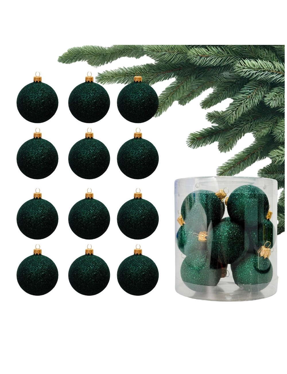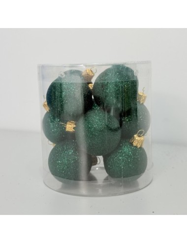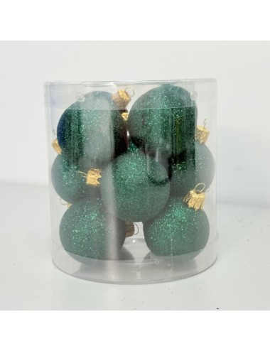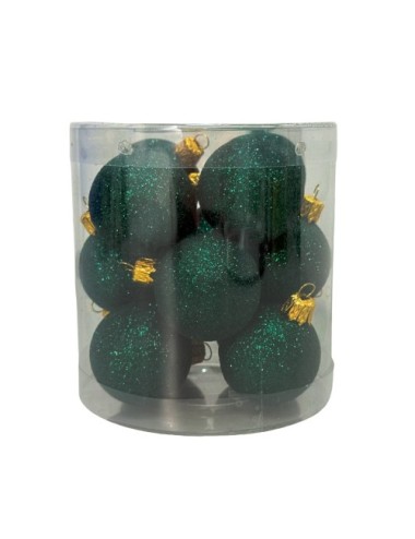 Zestaw 12 butelkowo-zielonych bombek holograficznych z brokatem, o średnicy 40 mm. Idealne na choinkę, trwałe i efektowne, dodadzą blasku każdej świątecznej dekoracji.