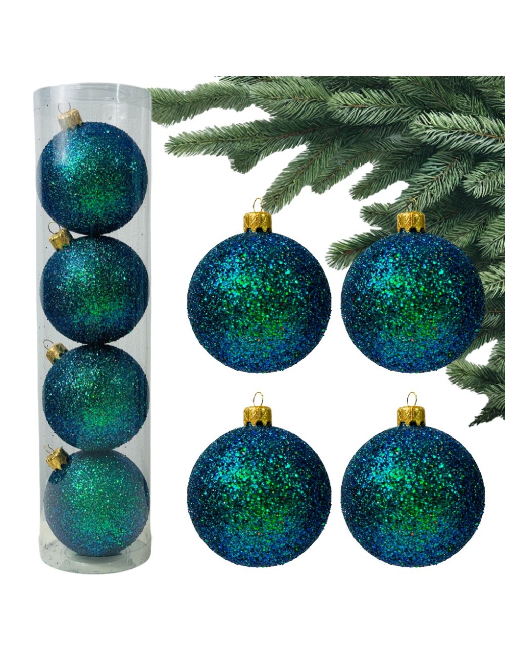 Plastikowe Bombki Holograficzne Turkusowo-zielone brokatowe 80 mm - Zestaw 4 szt