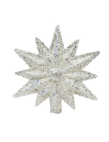 Dodaj blasku swojej choince dzięki 12-ramiennej gwieździe w platynowym brokacie. Wysoka na 17 cm, idealnie pasuje na czubek i wprowadza świąteczną magię do każdego wnętrza.