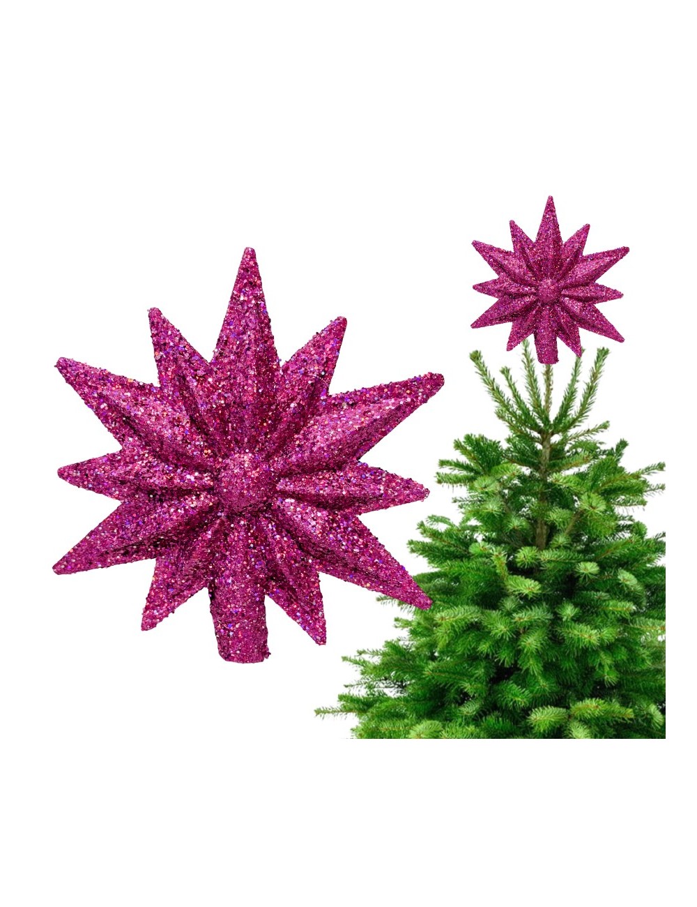 Czubek choinkowy w kształcie 12-ramiennej gwiazdy w fuksjowym brokacie to doskonały wybór do dekoracji choinki. Jego imponujące 17 cm wysokości przyciąga wzrok i ożywia świąteczny klimat, sprawiając, że Twoje święta będą jeszcze bardziej wyjątkowe.