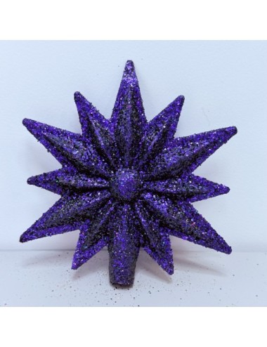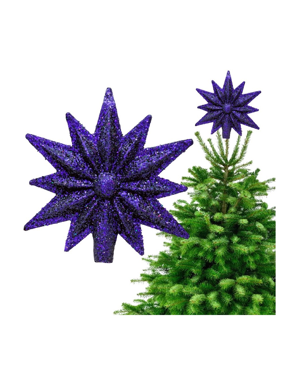 Czubek choinkowy w kształcie 12-ramiennej gwiazdy o wymiarach 17 cm, w ciemno-fioletowym kolorze z brokatem holograficznym. Idealny do dekoracji choinki, dodaje blasku i wyjątkowego stylu, idealnie wpisując się w świąteczną atmosferę.