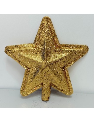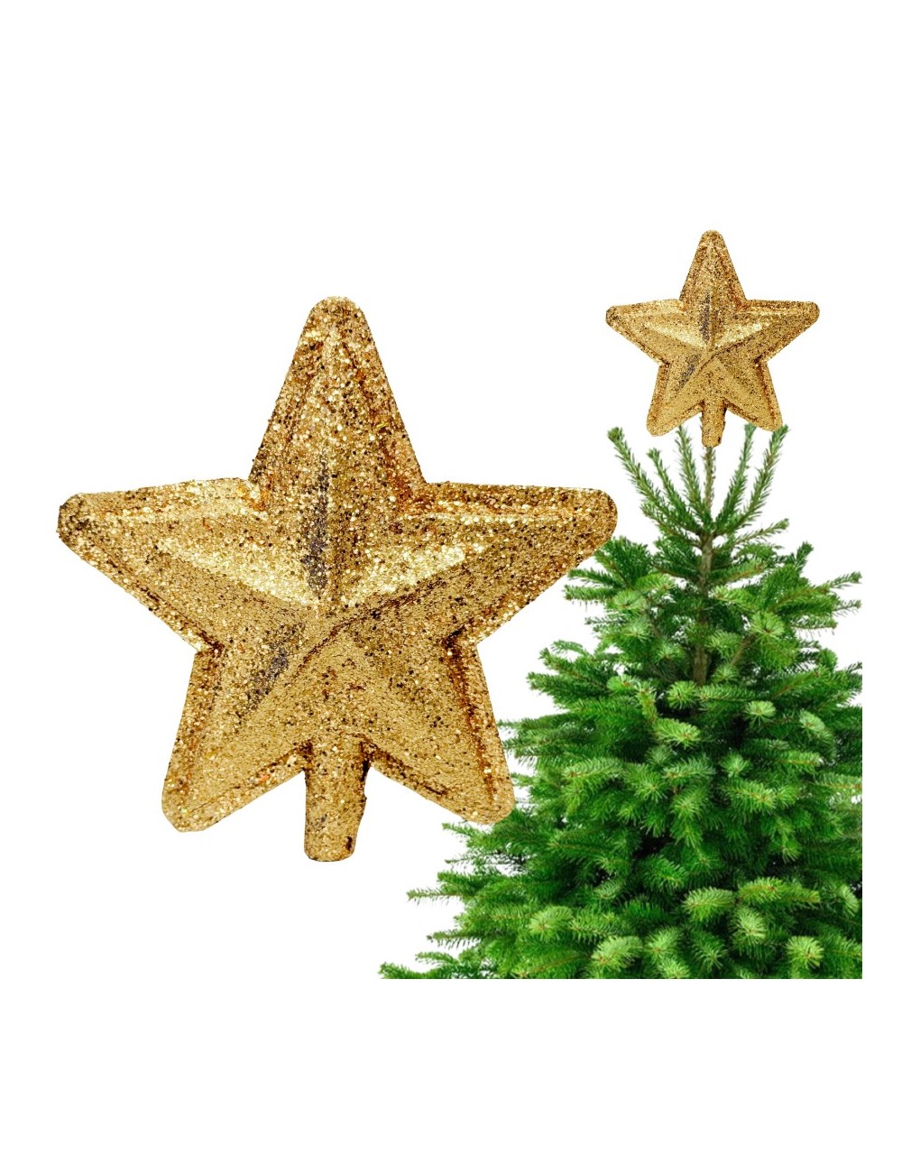 Złota, brokatowa gwiazda na czubek choinki o wyjątkowym kształcie. Ma 18 cm wysokości, jest łatwa w instalacji i doskonała do świątecznej dekoracji. Idealna na Boże Narodzenie!
